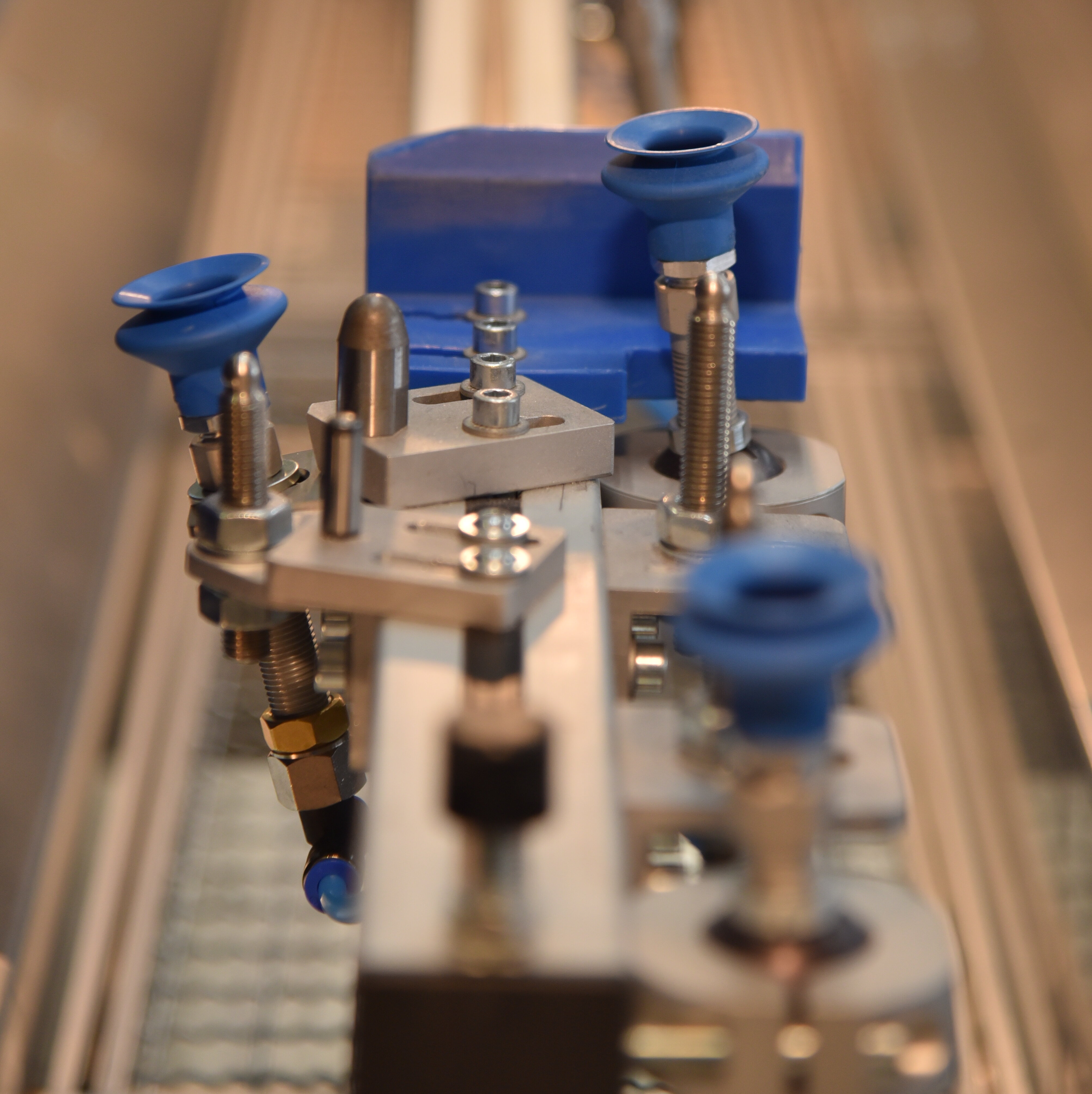 Das Rohteil wird nach dem Pressvorgang und vor dem nachfolgenden Lackierprozess mit Hilfe dieses Montagearbeitsplatz bearbeitet. Es werden Gewindeeinsätze mit einem Schraubsystem eingebracht, die Presskanten manuell entgratet und verschliffen sowie mit drei automatischen Fräseinheiten, abhängig von der Teilevariante, Fräsvorgänge ausgeführt.