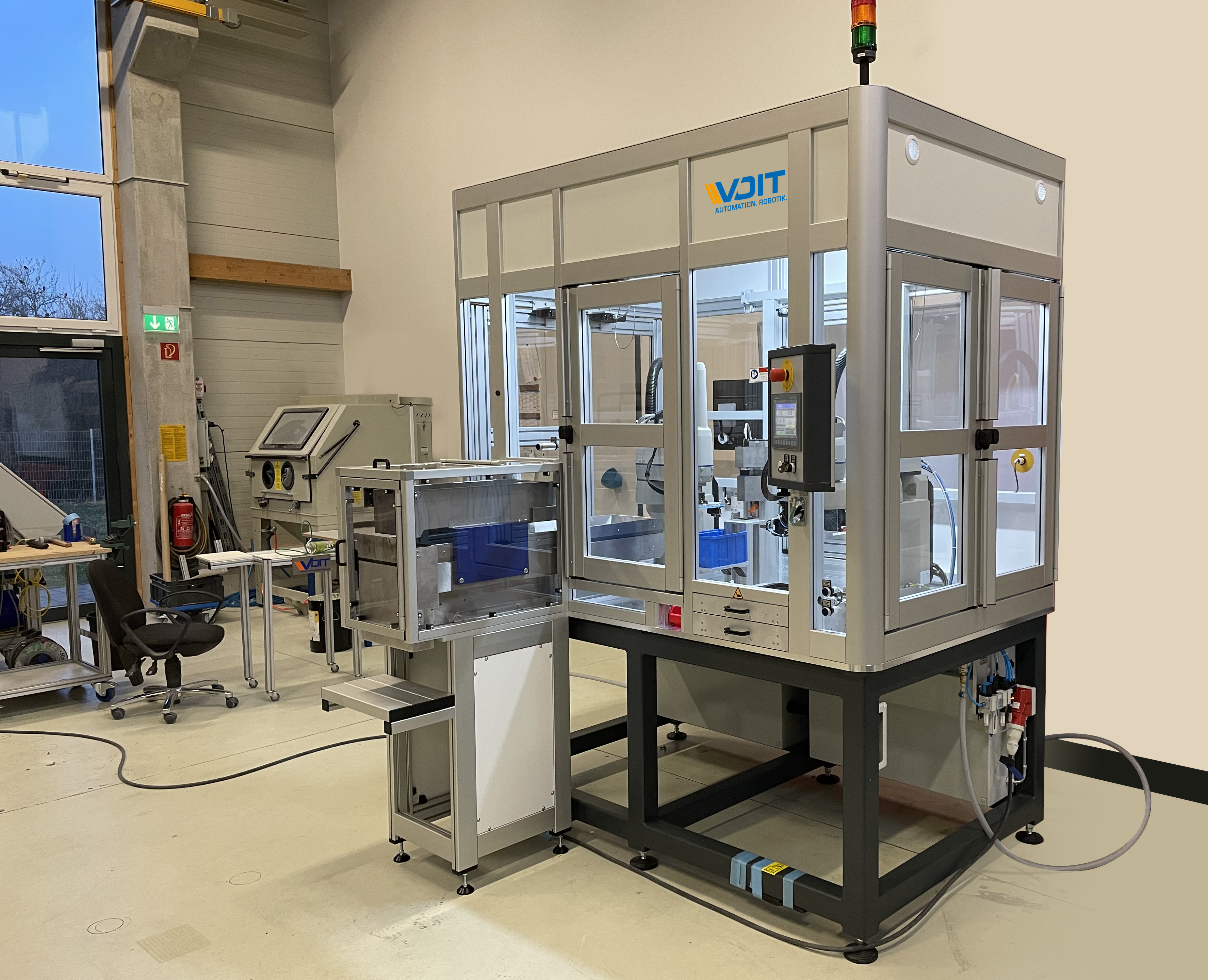 Gehandhabt werden die Teile durch zwei Scara-Roboter mit Greifsystemen. Parallel zum Sortiervorgang werden die Kontakte einer Qualitätsprüfung unterzogen indem mit einem Kamerasystem die Winkel- und Längenmaße überprüft werden. Die Automation erzielt eine Stundenleistung von 1500 Kontakten.